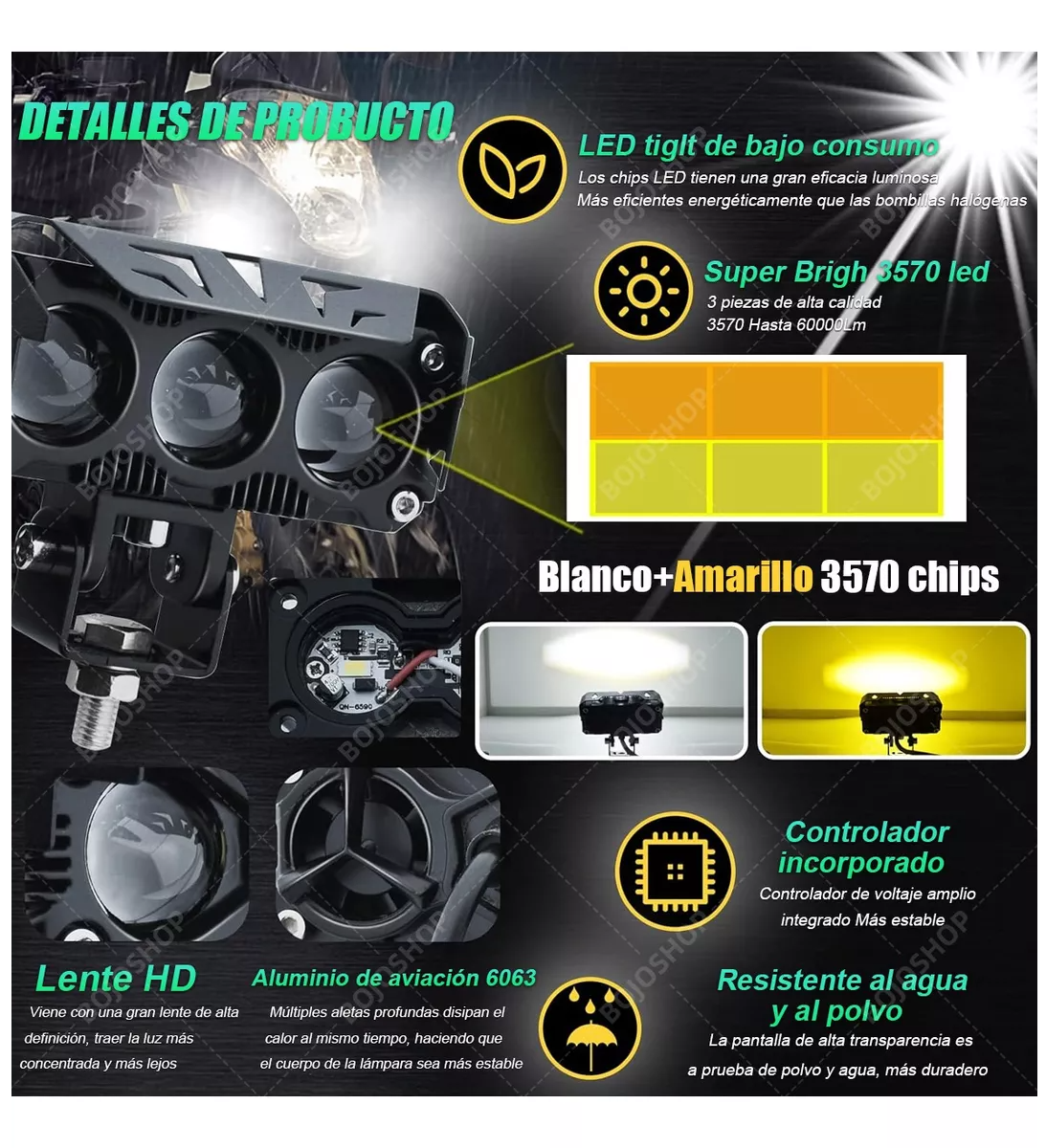 - Temperatura de Color: 6000K (blanco), 3000K (amarillo)