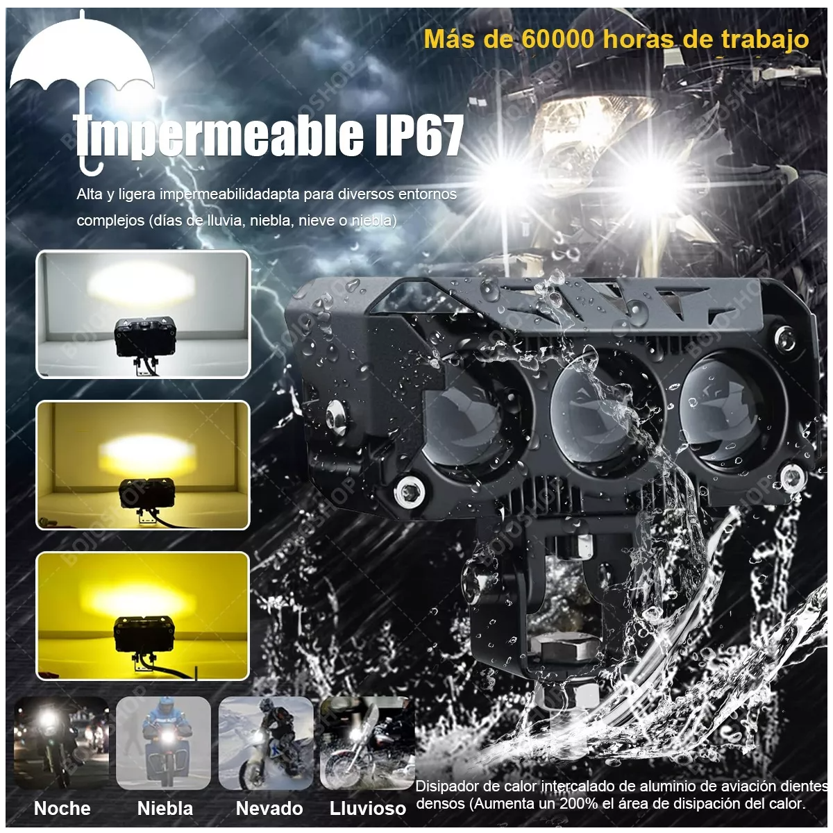 Resistente al Mal Tiempo: Gracias a su diseño de lentes bifocales, los focos refractan y enfocan la luz, ofreciendo un rendimiento óptimo en condiciones adversas como lluvia, niebla o nieve. Además, cuentan con una clasificación IP68, siendo resistentes al agua, polvo, golpes y corrosión.